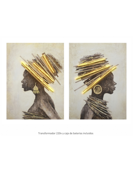 Set 2 lienzos impresos África pura 50% óleo luz leds 60x80 cm, un conjunto de dos lienzos que celebra la belleza y la elegancia de la mujer africana con un toque de modernidad y luminosidad. Estas obras de arte presentan retratos de mujeres de perfil, con elaborados tocados dorados que resaltan sus rasgos y su porte distinguido. Los colores cálidos y terrosos, predominantes en la composición, crean una atmósfera acogedora y llena de vida. La incorporación de luces LED, estratégicamente ubicadas en los tocados y los adornos, añade un elemento de sorpresa y dinamismo, creando un efecto visual cautivador y lleno de brillo.