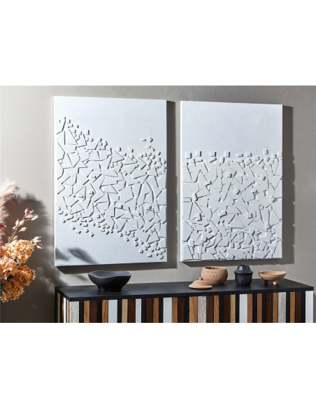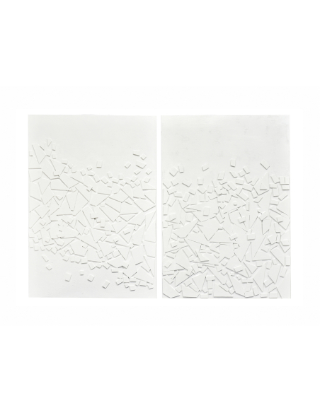 Set 2 óleos abstractos figuras geométrica 70x100 cm, un conjunto de óleos que te invita a explorar un mundo de formas, texturas y relieves, creando una experiencia visual y táctil única. Estas obras de arte abstractas presentan una composición de figuras geométricas, como cuadrados, rectángulos y fragmentos irregulares, superpuestas y elevadas sobre el lienzo, creando un efecto tridimensional y dinámico. Los tonos blancos, predominantes en la composición, aportan luminosidad y amplitud, mientras que los relieves, elaborados con poliespán, añaden una dimensión táctil y una sensación de profundidad. El set de dos cuadros te permite crear una composición equilibrada y armoniosa en tu pared, ya sea colocándolos juntos o por separado.
