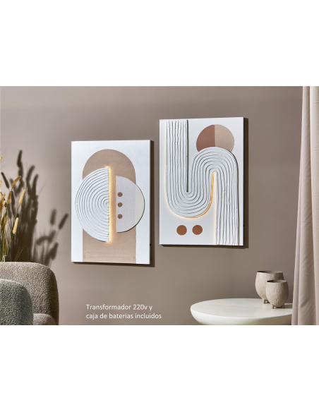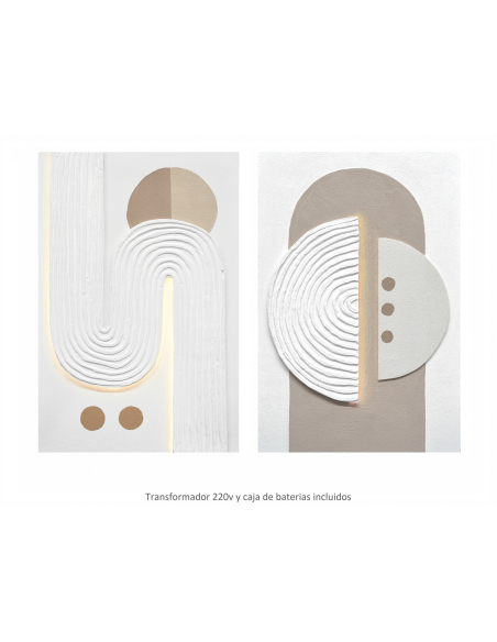 Set 2 óleos abstractos Arcoíris luz led 60x90 cm, un conjunto de dos cuadros que te invita a explorar un mundo de formas, texturas y luces, creando una experiencia visual y táctil única. Estas obras de arte abstractas presentan una composición de relieves y texturas superpuestas, creando un efecto tridimensional y dinámico que invita al tacto. Los tonos neutros, predominantes en la composición, se combinan con toques de color y brillo, creando un equilibrio armonioso y sofisticado. La incorporación de luces LED, estratégicamente ubicadas en los cuadros, añade un elemento de sorpresa y modernidad, resaltando los relieves y creando un juego de luces y sombras que transforma la obra por completo. El set de dos cuadros te permite crear una composición equilibrada y armoniosa en tu pared.
