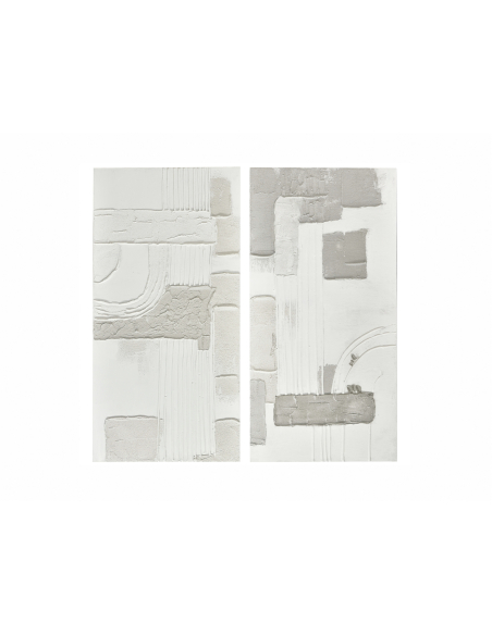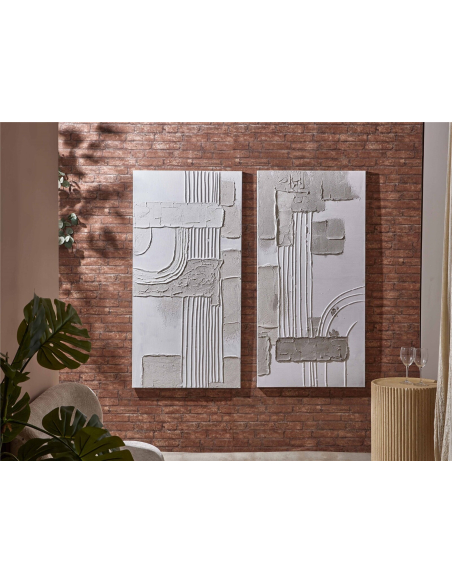Set 2 óleos abstractos relieves texturas 70x140 cm, un conjunto de dos óleos que te invita a explorar un mundo de texturas, relieves y formas abstractas, creando una experiencia visual y táctil única. Estas obras de arte presentan una composición de relieves blancos sobre un fondo también blanco, creando un efecto minimalista y sofisticado. Las diferentes texturas, aplicadas con maestría, añaden profundidad y dinamismo a la obra, invitando al espectador a acercarse y explorar cada detalle. La luz, al incidir sobre los relieves, crea un juego de luces y sombras que cambia según el ángulo de visión y la iluminación del espacio. El set de dos cuadros te permite crear una composición equilibrada y armoniosa en tu pared, ya sea colocándolos juntos o por separado. Perfectos para el salón, el dormitorio o la oficina.