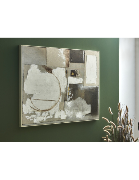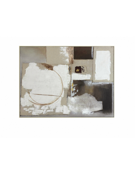 Cuadro abstracto arpillera y óleo 92x122 cm, obra decorativa en formato rectangular con marco de polietileno y bastidor de pino, que combina arpillera y óleo para crear un efecto de texturas en relieve. El diseño abstracto con trazos geométricos y colores neutros aporta dinamismo y carácter artístico, convirtiéndose en el complemento ideal para paredes de salones, dormitorios o despachos. Gracias a su paleta en tonos tierra, blancos y grises, resulta muy versátil y fácil de integrar en diferentes estilos decorativos. Su tamaño de 92x122 cm lo convierte en una pieza protagonista que transforma cualquier espacio con un aire moderno y sofisticado.