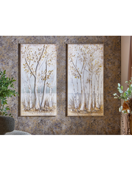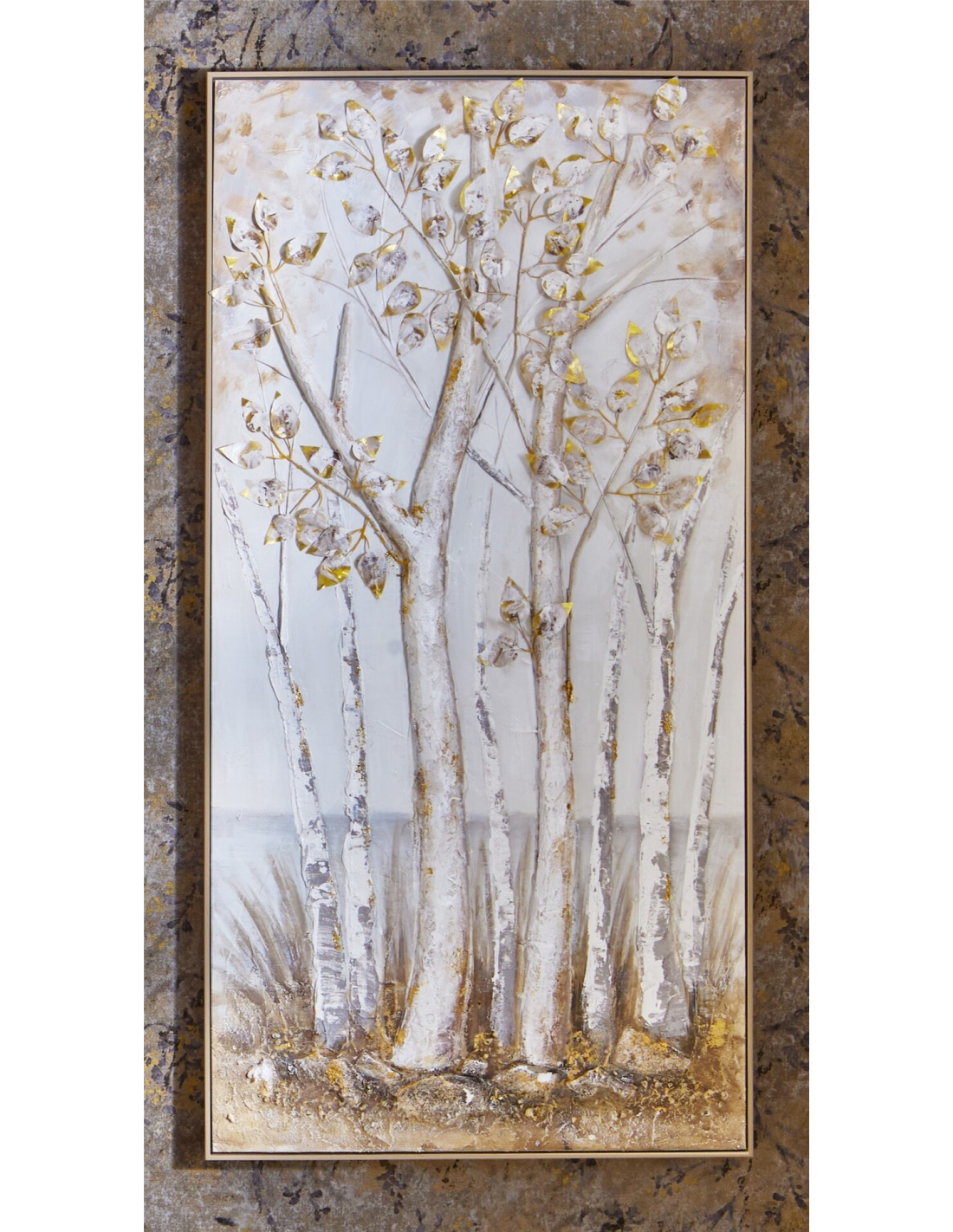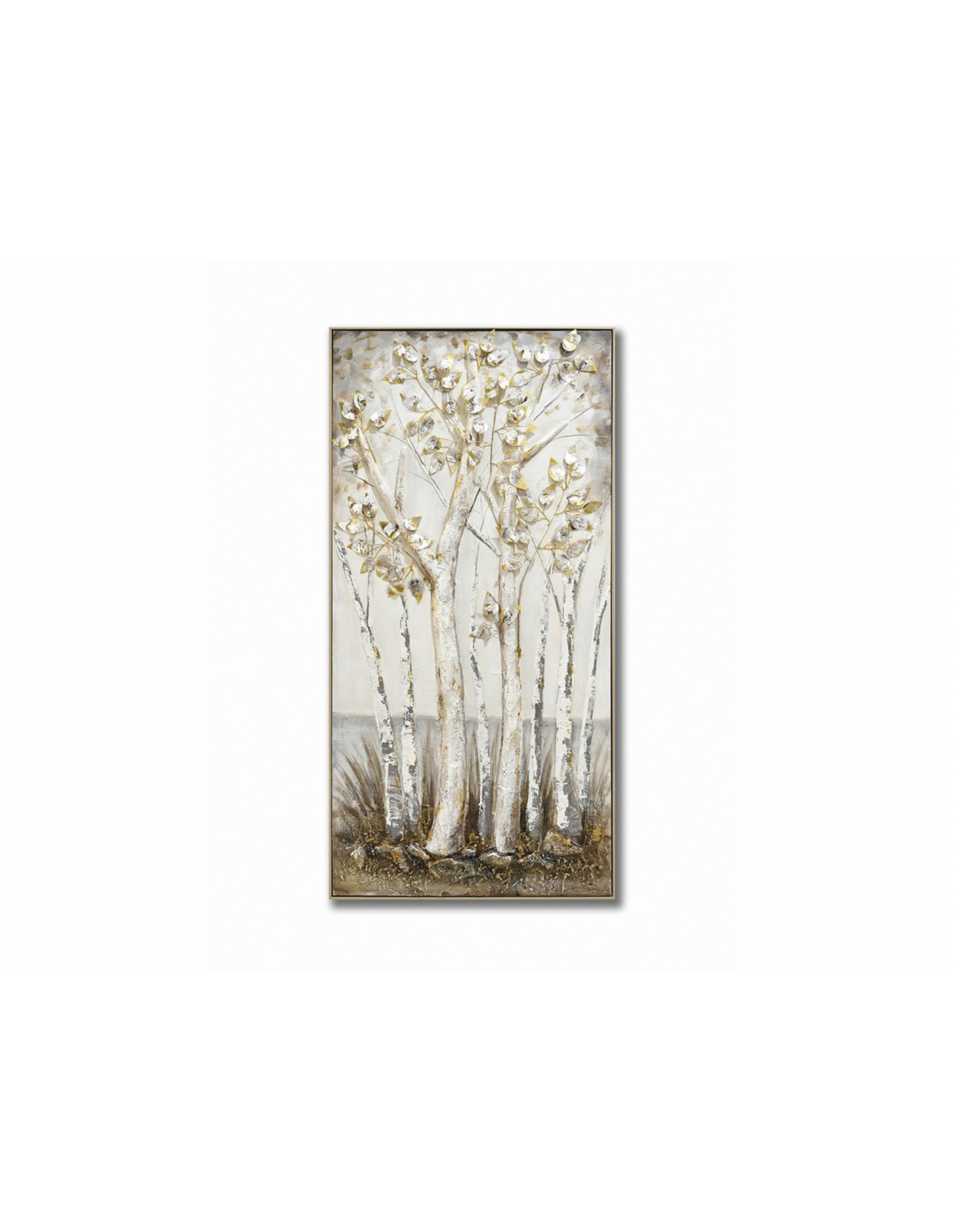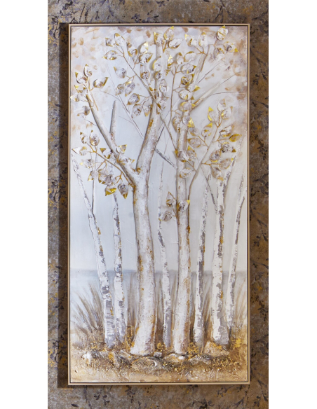 Cuadro 8 Árboles en relieve madera con marco, pieza con bastidor de pino y marco PE que presenta un detallado relieve de árboles estilizados en tonos cálidos y dorados. El acabado texturizado aporta profundidad y realismo, convirtiéndolo en un complemento ideal para crear un ambiente acogedor y natural. Perfecto para destacar paredes amplias, este cuadro se adapta tanto a salones modernos como a decoraciones de estilo rústico o nórdico, aportando calidez y personalidad.