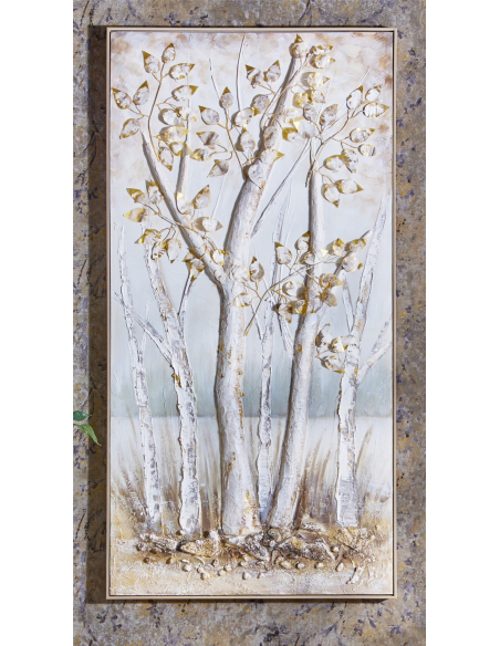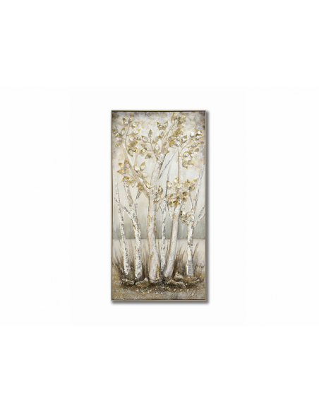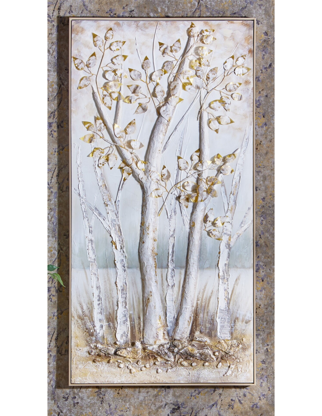 Cuadro 6 Árboles en relieve madera con marco, lienzo con bastidor de pino que realza la belleza de la naturaleza con un diseño en relieve de árboles. Sus tonalidades suaves y detalles dorados transmiten serenidad y equilibrio, convirtiéndose en una pieza ideal para aportar un toque orgánico a la decoración. Perfecto para ubicar en espacios amplios como comedores, pasillos o salas de estar, su diseño atemporal lo hace fácil de integrar con distintos estilos decorativos.