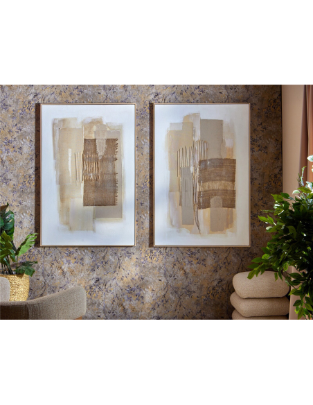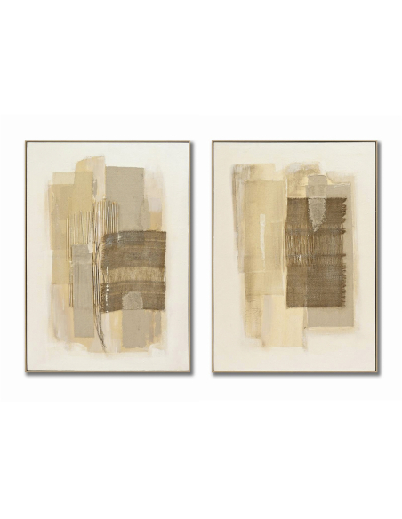 Set 2 cuadros abstractos arpillera 120 cm, lienzos con bastidor de pino y enganche en posición vertical, que se destacan por la riqueza en texturas y la combinación de arpillera con técnicas mixtas. Su estilo artesanal y sofisticado lo convierte en una propuesta decorativa única, capaz de llenar de carácter paredes neutras o minimalistas. Perfectos para colocarse en conjunto, aportan armonía y un aire contemporáneo que realza cualquier ambiente.