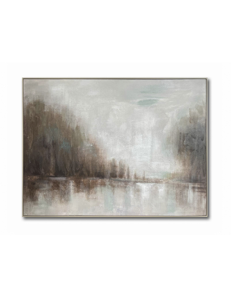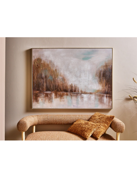 Lienzo impreso Río marrón con marco, lienzo con bastidor de pino y colgadores horizontales que reproduce un paisaje abstracto con tonos cálidos y marrones. Su diseño transmite serenidad y elegancia, evocando la calma de la naturaleza junto a la orilla de un río. Perfecto para salones, comedores o dormitorios, aporta una nota artística y acogedora que se integra fácilmente en diferentes estilos decorativos.