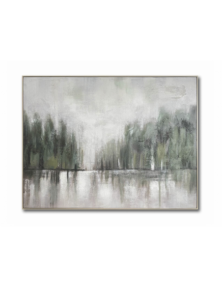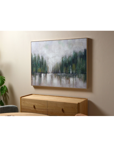 Lienzo impreso Río verde con marco, lienzo sobre bastidor de pino con colgadores horizontales que representa un paisaje natural con tonos verdes y pinceladas frescas. Su estilo abstracto transmite tranquilidad y armonía, convirtiéndolo en una pieza perfecta para aportar frescura a espacios modernos o clásicos. Ideal para colgar sobre sofás, cabeceros o muebles de almacenaje, se convierte en un foco visual atractivo y elegante.
