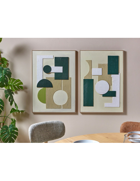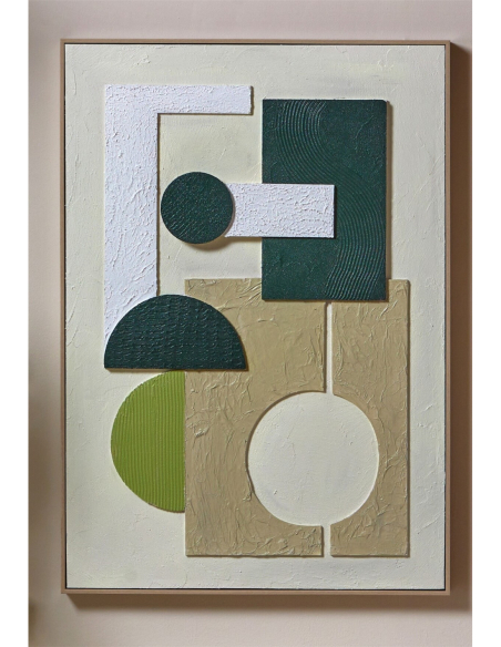 Cuadro abstracto relieves verdes blancos con marco, una pieza artística en la que las formas geométricas y texturas en relieve se combinan en tonos verdes y blancos para aportar frescura y dinamismo. Su acabado moderno y elegante convierte cualquier pared en un punto focal, ideal tanto para salones como para despachos contemporáneos. Con bastidor de pino y colgadores para posición vertical, es perfecto para quienes buscan un arte decorativo versátil y duradero que aporte estilo a su hogar.