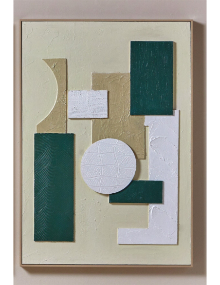 Cuadro abstracto relieves blancos verdes con marco, diseñado con relieves en diferentes planos que generan un atractivo juego de luces y sombras. Los tonos blancos y verdes transmiten calma y naturalidad, integrándose con facilidad en distintos estilos de interiorismo. El marco aporta un acabado sofisticado y garantiza estabilidad, mientras que su orientación vertical lo hace ideal para pasillos, recibidores o como pareja de cuadros decorativos. Fabricado con bastidor de pino, combina estética y resistencia en una sola pieza.