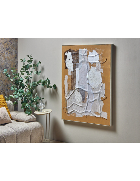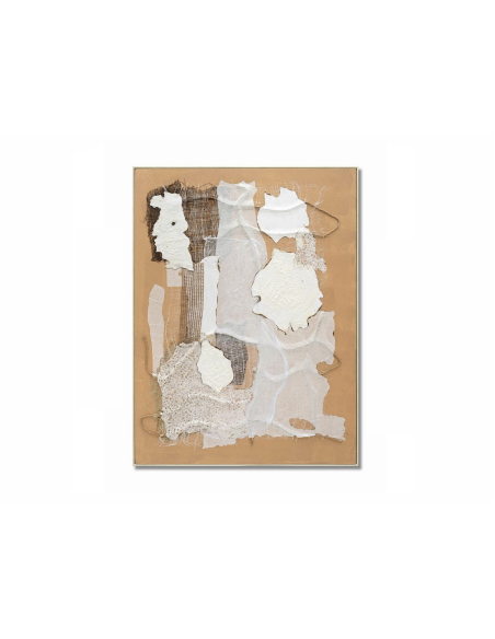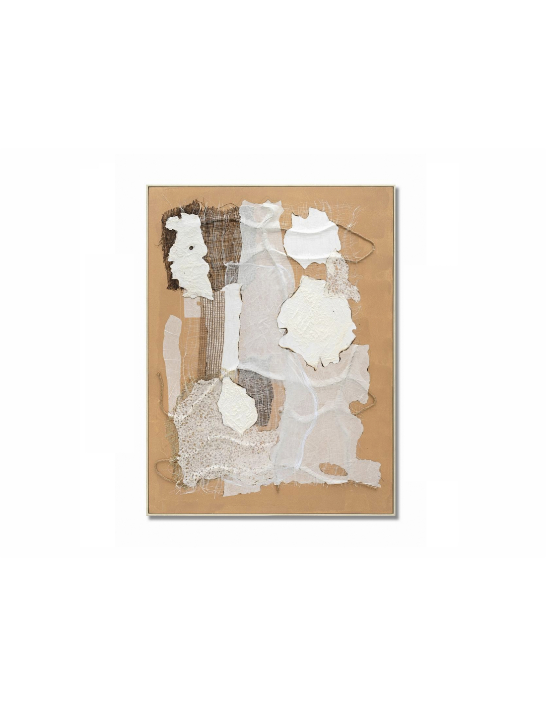 Cuadro abstracto telas con marco 92x122 cm, un cuadro que destaca por la superposición de diferentes telas en relieve, creando una composición única llena de movimiento y textura. Cada pieza de tela se integra en tonos neutros y cálidos, logrando un equilibrio perfecto entre originalidad y elegancia. Ideal para salones amplios o recibidores, este cuadro en bastidor de pino con marco PE es una apuesta por la decoración vanguardista que combina materiales y artesanía en una propuesta artística sofisticada.