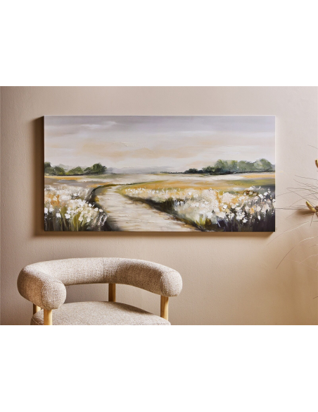Lienzo impreso paisaje abstracto 50% óleo 140x70 cm, una pieza decorativa que transmite calma con sus tonalidades suaves y pinceladas de óleo que realzan los detalles del paisaje. Impreso sobre lienzo con bastidor de pino, combina la técnica impresa con acabados al óleo que le aportan textura y profundidad. Ideal para dormitorios o salones donde se busque un toque artístico y relajante, convirtiéndose en el centro de todas las miradas gracias a su formato alargado.