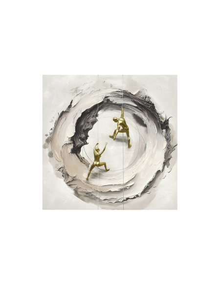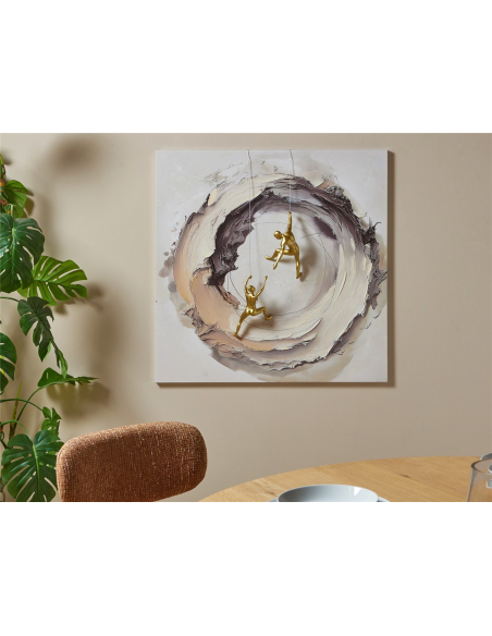 Lienzo abstracto escaladores en relieve 50% óleo, una obra innovadora que mezcla pintura en relieve y esculturas de resina en dorado, creando un efecto tridimensional impactante. Su diseño representa movimiento y dinamismo, ideal para quienes buscan una decoración moderna y diferente. Con bastidor de pino robusto y un grosor de 11 cm que refuerza su efecto escultórico, es perfecto para destacar en comedores o salones contemporáneos.