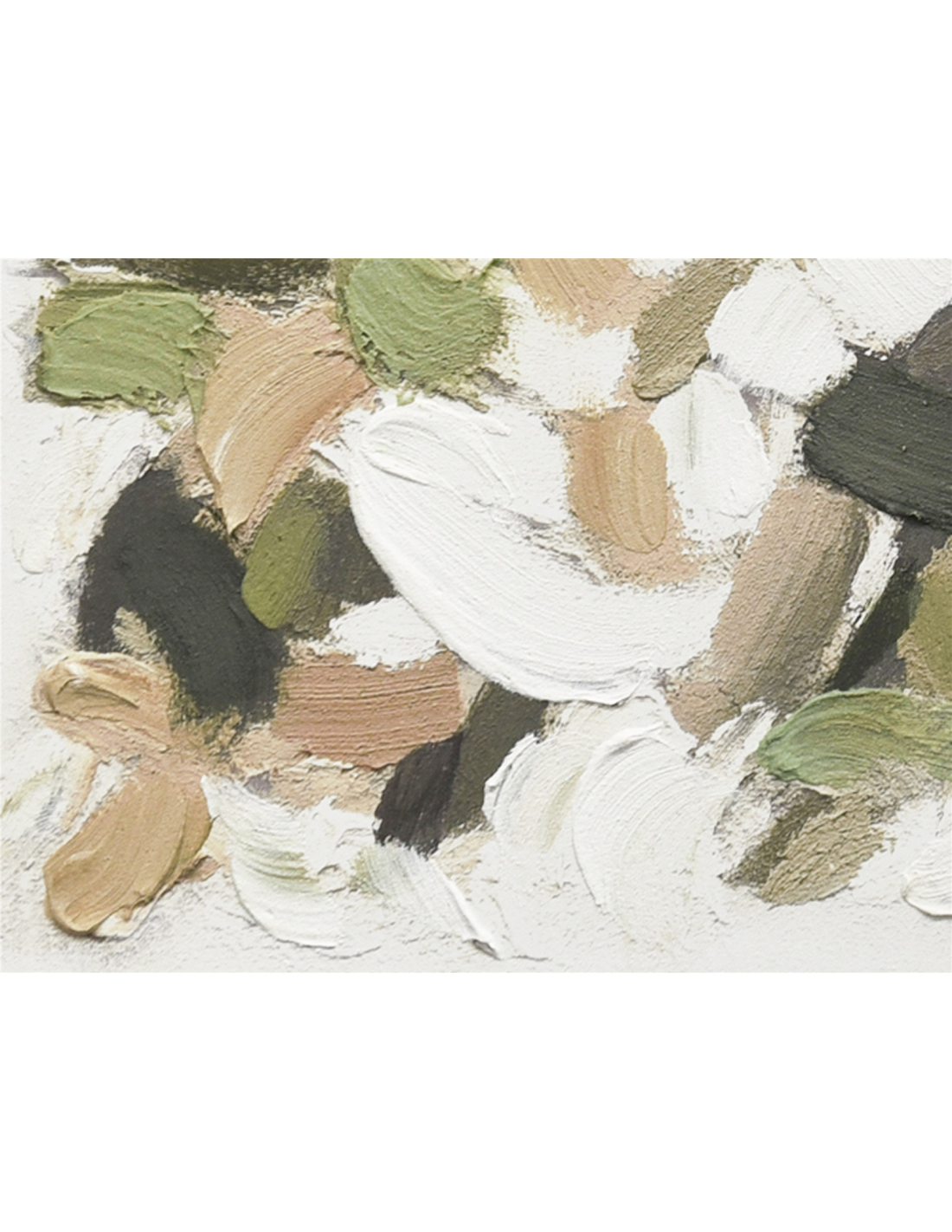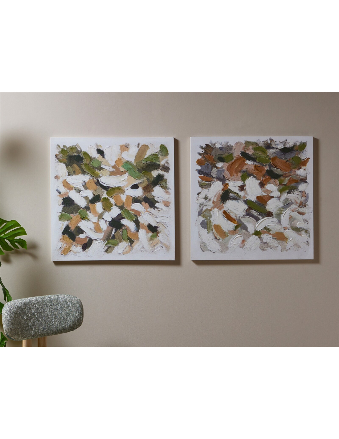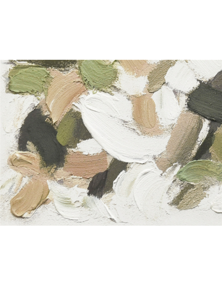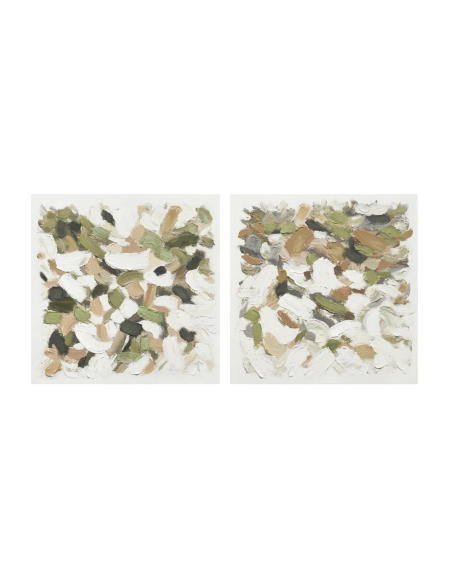 Set 2 lienzos impresos trazos verdes 70% óleo, un dúo de cuadros con pinceladas expresivas en tonos tierra y verdes que aportan equilibrio y sofisticación. El acabado al óleo les da relieve y un aspecto artesanal, destacando sobre su lienzo montado en bastidor de pino. Su formato cuadrado y versátil permite colgarlos juntos o por separado, adaptándose a paredes de distintas estancias para darles calidez natural.