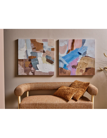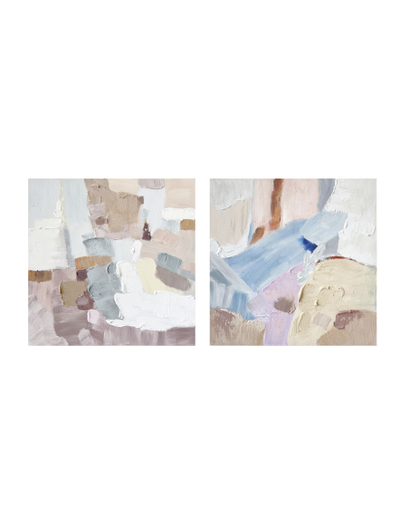 Set 2 lienzos impresos tonos pastel 70% al óleo, en colores suaves que transmiten serenidad y frescura, ideales para ambientes nórdicos o minimalistas. Sus trazos abstractos con acabado al óleo ofrecen textura y contraste, haciendo que cada pieza luzca como una obra única. Fabricados sobre bastidor de pino, garantizan durabilidad y calidad, aportando estilo tanto en dormitorios como en zonas de estar.