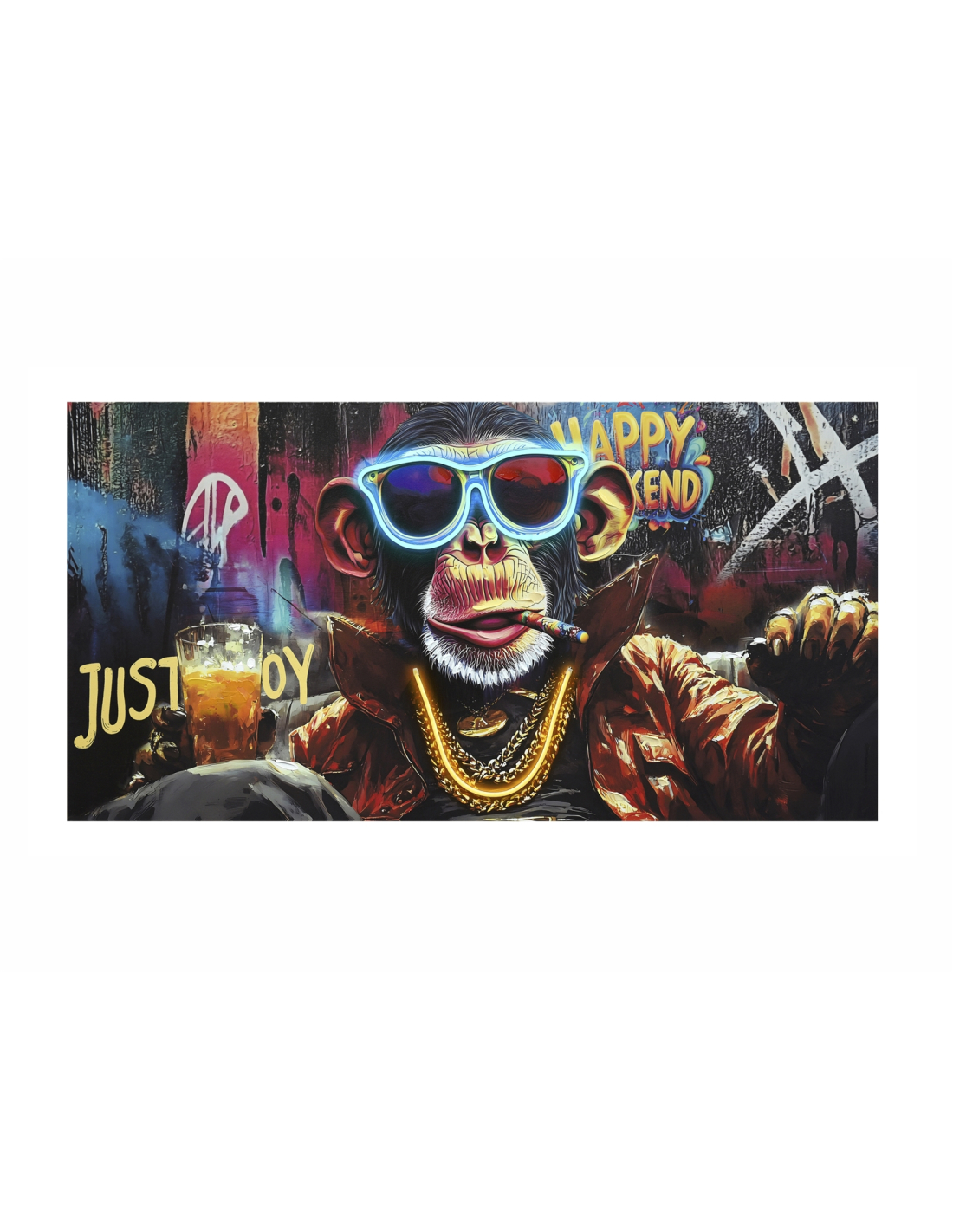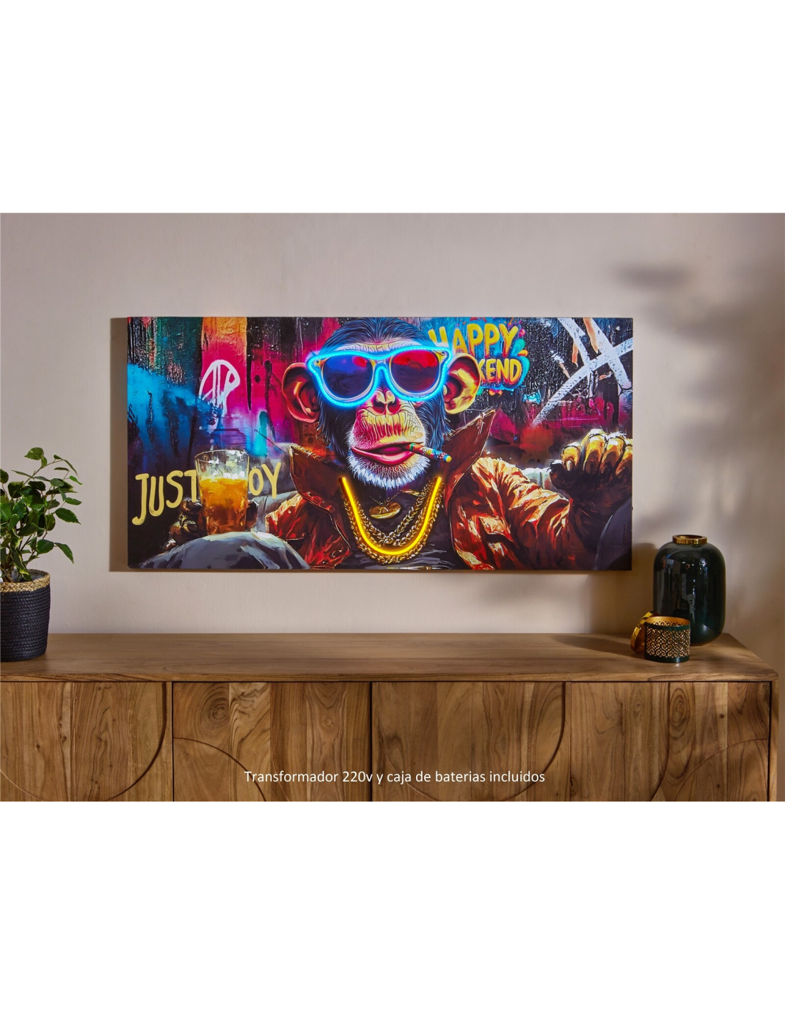 Lienzo impreso Pop Art mono 50% óleo con led, una pieza vibrante y divertida que combina el estilo urbano del pop art con la fuerza de los colores neón. La figura del mono con gafas de sol resalta gracias al efecto LED integrado, aportando dinamismo y un aire moderno a cualquier ambiente. Perfecto para quienes buscan un cuadro llamativo que se convierta en protagonista de la decoración, ideal en salones, bares o espacios juveniles. Funciona con adaptador de corriente o pilas, lo que lo hace práctico y versátil.
