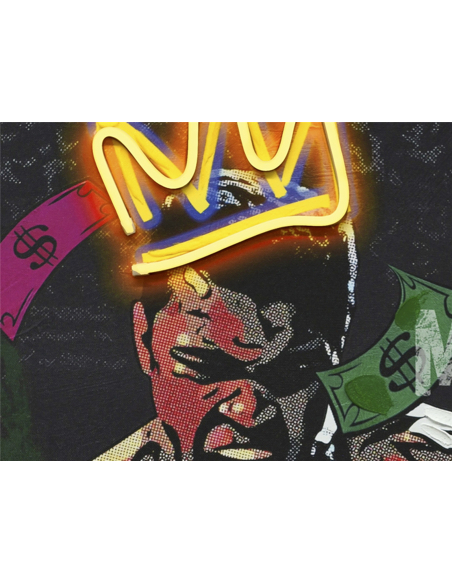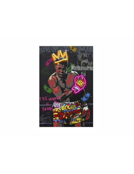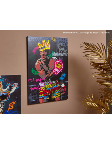Lienzo impreso Pop Art boxeador 50% óleo con led, un cuadro impactante que rinde homenaje a los grandes íconos del boxeo en una fusión de arte y energía. El estilo gráfico y los detalles pintados al óleo se potencian con luces LED, que iluminan la composición y la convierten en una pieza cargada de carácter. Su diseño moderno con tipografías y colores intensos es ideal para espacios contemporáneos, aportando fuerza y personalidad en la decoración.
