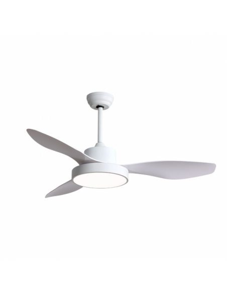 Ventilador HAYATE realizado en metal, madera y cristal, en color BLANCO con TRES aspas de color BLANCO. Tiene tres velocidades ajustables. Tecnología LED incorporada con una potencia de 40W, con 3 TEMPERATURAS DE LUZ( 300040006000K) y 3300 lúmenes. Su medida es de 39X120X120 cm. Control de aire verano o invierno. Mando a distancia INCLUIDO con MEMORIA DE COLOR incorporada y TEMPORIZADOR 1/2/4/8 H. Viene con dos medidas de Tija lo que permite adaptarlo para distintas alturas de techo. Modelo también disponible en Cuero Roble, Marrón y Níquel Haya.
