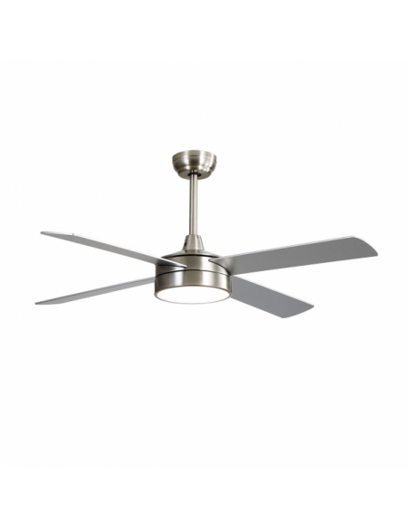 Ventilador NEVERY realizado en metal, madera y cristal, en color NIQUEL con CUATRO aspas REVERSIBLES de color HAYA/PLATA. Tiene tres velocidades ajustables. Tecnología LED incorporada con una potencia de 24W, con 3 TEMPERATURAS DE LUZ( 300040006000K) y 2950 lúmenes. Su medida es de 36X132X132 cm. Control de aire verano o invierno. Mando a distancia INCLUIDO con MEMORIA DE COLOR incorporada y TEMPORIZADOR 1/2/4/8 H. Viene con dos medidas de Tija lo que permite adaptarlo para distintas alturas de techo. Modelo también disponible en Cuero Roble/Cerezo, Blanco Haya/Blanco y Marrón Haya/Marrón.