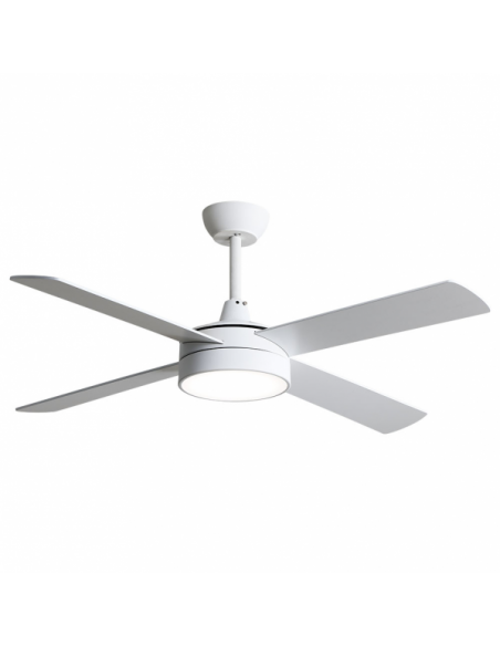 Ventilador NEVERY realizado en metal, madera y cristal, en color BLANCO con CUATRO aspas REVERSIBLES de color HAYA/BLANCO. Tiene tres velocidades ajustables. Tecnología LED incorporada con una potencia de 24W, con 3 TEMPERATURAS DE LUZ( 300040006000K) y 2950 lúmenes. Su medida es de 36X132X132 cm. Control de aire verano o invierno. Mando a distancia INCLUIDO con MEMORIA DE COLOR incorporada y TEMPORIZADOR 1/2/4/8 H. Viene con dos medidas de Tija lo que permite adaptarlo para distintas alturas de techo. Modelo también disponible en Cuero Roble/Cerezo, Marrón Haya/Marrón y Níquel Haya/Plata.