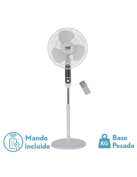 Ventilador de Pie CALMA en color BLANCO con tres aspas y tres velocidades. Dos posiciones, fijo y rotatorio. Tiene una medida con altura regulable de 114<130x43x40 centímetros. Mando a distancia INCLUIDO y TEMPORIZADOR de 0,5 a 7,5 horas. Modelo también disponible en color Negro.