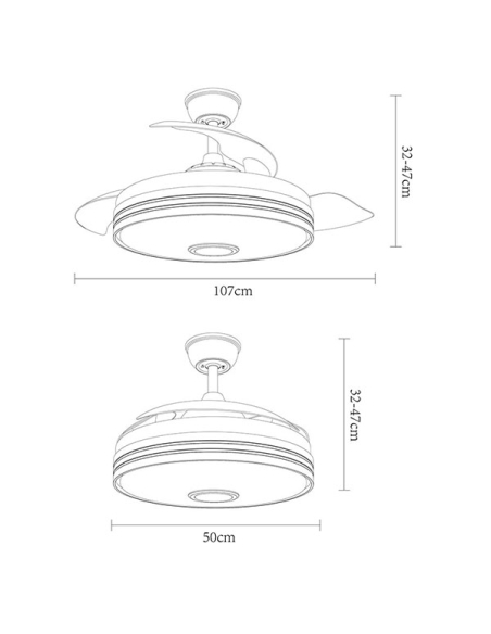 Ventilador MATANUSKA de color BLANCO con tres aspas DESPLEGABLES de metacrilato muy resistentes de color transparente y seis velocidades. Motor DC .Realizado en metal, policarbonato y metacrilato. Tecnología LED integrada con una potencia de luz de 72 watios, 7200 lúmenes. Con 3 temperaturas de luz (3000, 4000, 6000 k). Control de aire para verano o invierno. Mando a distancia INCLUIDO con MEMORIA DE COLOR incorporada y TEMPORIZADOR 1/2/4H. Con ALTAVOZ INCORPORADO y RECEPCION BLUETOOTH . Su medida es de 32/47X55 centímetros con las aspas plegadas y de 32/47X108 centímetros con las aspas desplegadas, con dos medidas de tija para instalarlo a distintas alturas. Modelo también disponible en Níquel.