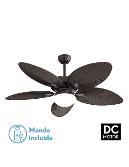 Ventilador DC serie BORASCO realizado en metal, ABS y cristal, en color MARRON con cinco aspas de diseño HOJA DE PALMA TROPICAL de color MARRON. Tiene seis velocidades ajustables Con INSTALACION DE LUZ OPCIONAL. Tecnología LED incorporada con una potencia de 24W, con 3 TEMPERATURAS DE LUZ (3000-4000-6000K) y 2950 lúmenes. Su medida es de 38/50,5X132X132 centímetros, viene con DOS MEDIDAS DE TIJA, lo que permite adaptarlo a distintas alturas de techo Control de aire verano o invierno. Mando a distancia INCLUIDO con MEMORIA DE COLOR incorporada y TEMPORIZADOR 1/2/4/8 H. Modelo también disponible en Níquel/Marrón.
