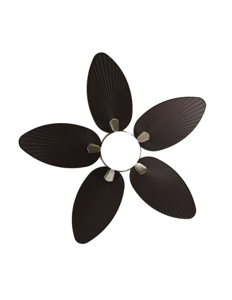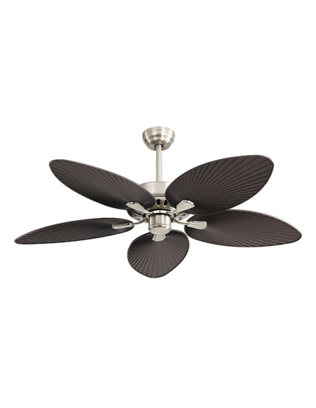Ventilador DC serie BORASCO realizado en metal, ABS y cristal, en color NIQUEL con cinco aspas de diseño HOJA DE PALMA TROPICAL de color MARRON. Tiene seis velocidades ajustables. Con INSTALACION DE LUZ OPCIONAL. Tecnología LED incorporada con una potencia de 24W, con 3 TEMPERATURAS DE LUZ (3000-4000-6000K) y 2950 lúmenes. Su medida es de 38/50,5X132X132 centímetros, viene con DOS MEDIDAS DE TIJA, lo que permite adaptarlo a distintas alturas de techo Control de aire verano o invierno. Mando a distancia INCLUIDO con MEMORIA DE COLOR incorporada y TEMPORIZADOR 1/2/4/8 H. Modelo también disponible en Marrón.