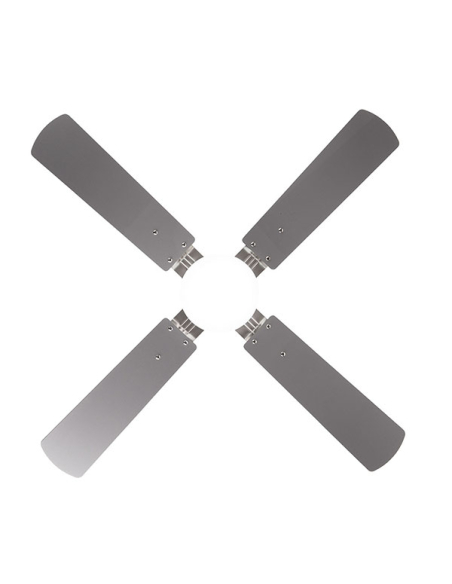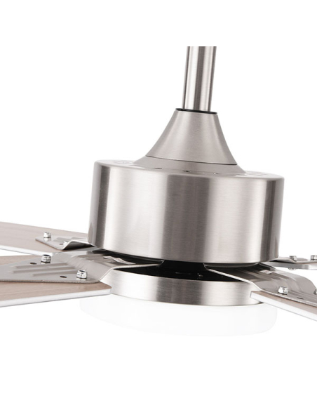 Ventilador serie HUPE en color NIQUEL y cuatro aspas REVERSIBLES en color PLATA/HAYA. Motor DC con seis velocidades. Tiene luz integrada con 18 watios de potencia, 2350 lúmenes y TRES TEMPERATURAS DE LUZ 3000-4000-6000k (cálida, blanco natural y blanco frío). Sus dimensiones son 38/50,5x107x107 centímetros, con dos medidas de tijas para diferentes alturas. Está realizado en metal, MDF y policarbonato. MEMORIA DE COLOR, MANDO A DISTANCIA y TEMPORIZADOR INCLUIDO. Control de aire verano/invierno. También disponible en color Blanco y en Cuero/Cerezo-Nogal.