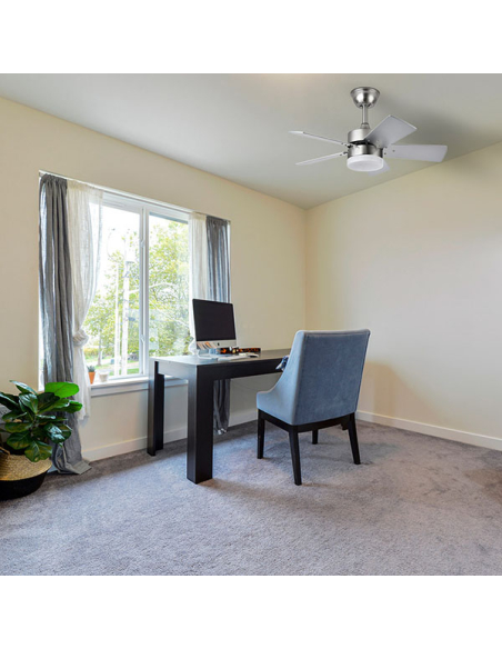 Ventilador DC serie MARTA de color NIQUEL con cinco aspas REVERSIBLES en color HAYA/PLATA y seis velocidades. Sus dimensiones son 41x76x76 centímetros. Posee Tecnología LED integrado con una potencia de 36 W, 3240 lúmenes y luz seleccionable en 3 posiciones (3000k color blanca cálida, 4000k color blanca neutra, y 6000k color blanca fría), además de memoria de color. Tiene control remoto INCLUIDO con la opción verano/invierno y la opción de temporizador de 1 hasta 4 horas. El cuerpo del ventilador es de metal y policarbonato, y las aspas de MDF. Disponible también en color Cuero-Cerezo/Nogal y en Blanco-Blanco/Haya.