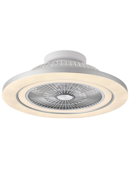 Ventilador de la serie MATO color NIQUEL, con cinco aspas transparentes y 6 velocidades. Motor DC. Realizado en metal, ABS y policarbonato. De diseño muy moderno y original. Tecnología LED integrada con 72 watios de potencia , 6120 lúmenes, con 3 colores de luz y REGULABLE EN INTENSIDAD (3000ºk-4000ºk-6000ºk). Incluye MANDO A DISTANCIA, con MEMORIA DE COLOR incorporada y TEMPORIZADOR 1/2/4/8 H. Sus dimensiones son 22x58x58 centímetros. En esta serie, disponibles en color cuero, níquel y blanco.
