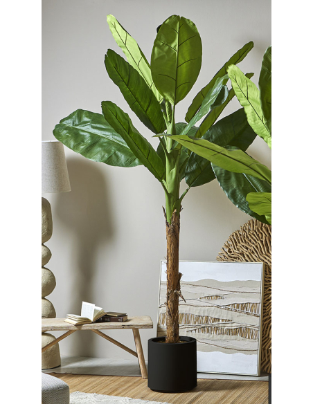 Árbol artificial Bananero 250 cm. Esta planta viene acompañada de una maceta cilíndrica en color negro. Sumérgete en un oasis tropical sin salir de casa con este bananero artificial. Sus hojas exuberantes y su aspecto realista te transportarán a un paraíso tropical en cualquier época del año. Sus hojas frondosas y su diseño auténtico añaden un toque fresco y relajado a tu espacio, sin la necesidad de cuidados constantes. Este árbol artificial esta disponible en diferentes medidas.