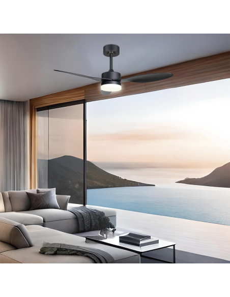 Ventilador Valcano Negro 107 cm 3 palas es una opción elegante y funcional para cualquier habitación de la casa. Con un motor DC de 20w, este ventilador ofrece un rendimiento eficiente y silencioso, perfecto para espacios de 13-20 metros cuadrados. Además, cuenta con una potencia de lux de 20w y 1850 lm, lo que garantiza una iluminación adecuada en la habitación. Incluye un regulador de intensidad con 6 velocidades, un temporizador y modos de funcionamiento para invierno, verano y brisa. Con un nivel sonoro de tan solo 20db, podrás disfrutar de un ambiente tranquilo y fresco en todo momento. El mando a distancia permite controlar fácilmente todas las funciones del ventilador desde la comodidad de tu sofá.
