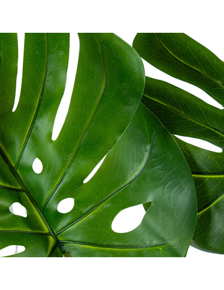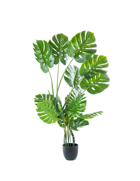 Planta artificial monstera 150cm, es una planta de tamaño intermedio que se caracteriza por su abundante follaje con hojas caladas en color verde intenso. Las hojas poseen el brillo característico de las monsteras, lo que le otorga un aspecto realista y vibrante. Viene en una maceta de color negro, adecuada para cualquier estilo decorativo. Esta planta es ideal para añadir un toque tropical a tu hogar u oficina sin requerir mantenimiento.