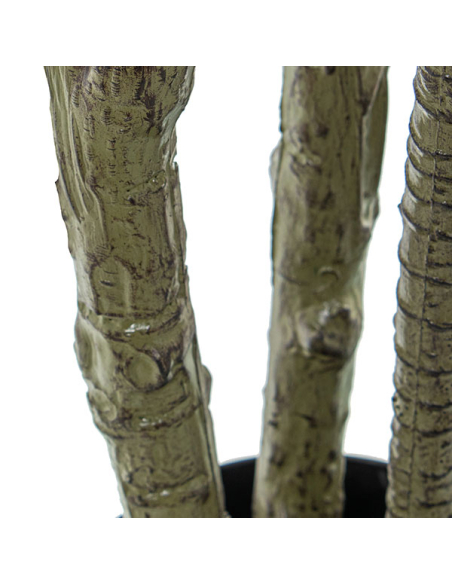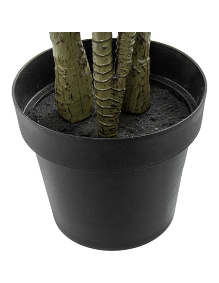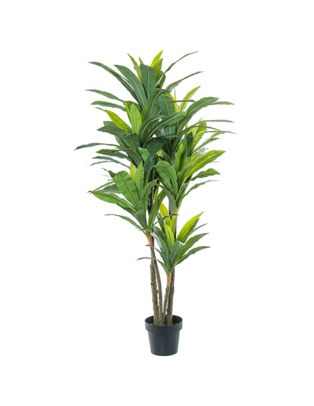 Planta artificial dracaena 160cm, tiene tres secciones texturadas, cada una coronada por un ramillete de hojas en distintas tonalidades de verde. Esta planta añade un toque de frescura y elegancia a cualquier espacio interior, sin los cuidados que requieren las plantas naturales. Se presenta en una maceta cilíndrica de color negro, que realza su diseño estilizado y moderno.