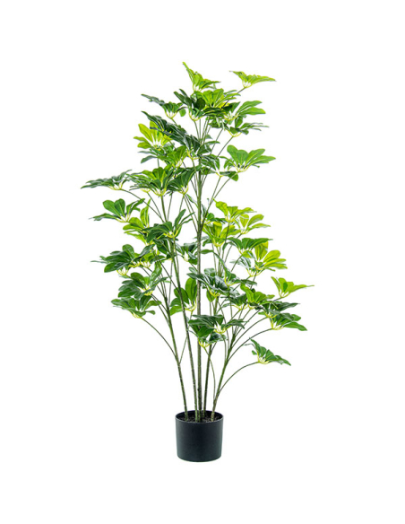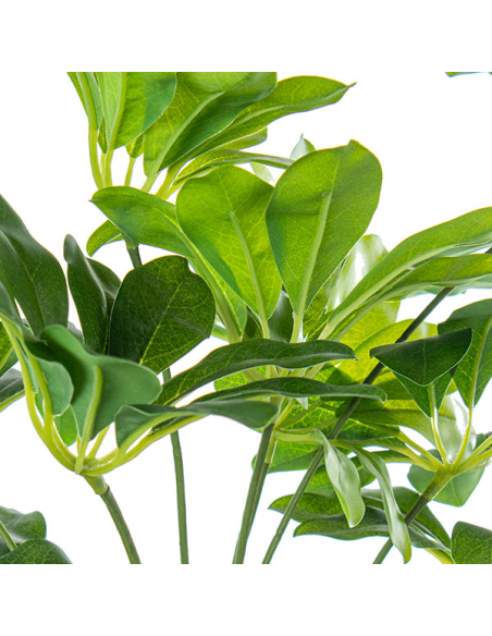 Planta artificial schefflera 125cm, ofrece un aspecto realista gracias a sus múltiples ramas cubiertas de hojas ovaladas que imitan a la perfección una planta natural. Las hojas presentan diferentes tonalidades de verde, añadiendo profundidad y realismo. Esta planta se presenta en una maceta cilíndrica de color negro, ideal para cualquier entorno decorativo. Perfecta para interiores, no requiere mantenimiento, proporcionando un toque verde sin esfuerzo.