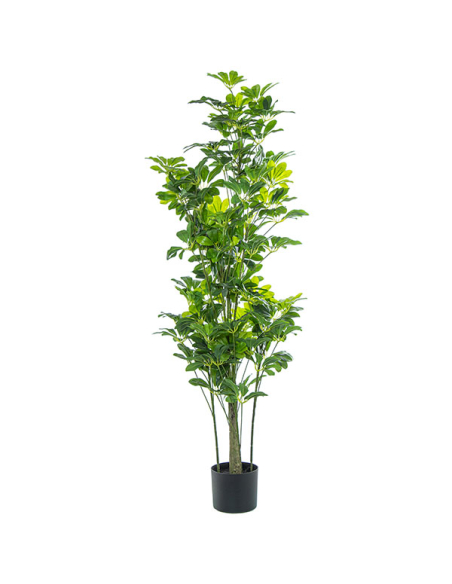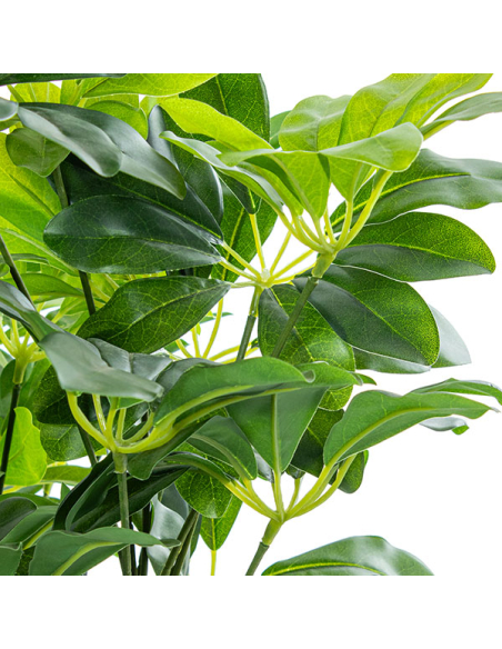 Planta artificial schefflera 155cm, es una opción excelente para quienes buscan una planta de gran tamaño que aporte vida y frescura a cualquier espacio. Con múltiples ramas y numerosas hojas ovaladas que imitan perfectamente una schefflera real, esta planta añade un toque natural sin necesidad de cuidados. Viene en una maceta cilíndrica de color negro, adecuada para cualquier estilo decorativo, ofreciendo una solución práctica y estética para la decoración de interiores.