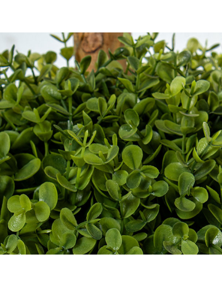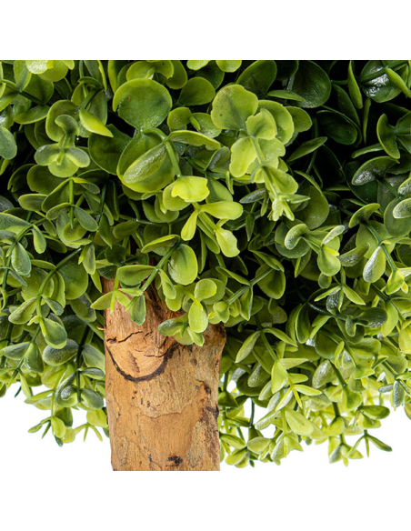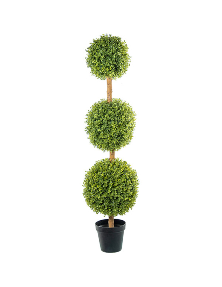 Planta artificial árbol del dinero con 3 bolas, está formada por tres secciones a diferentes alturas, cada una con un follaje circular que desciende de manera armoniosa. En las secciones intermedias, el tronco queda a la vista, añadiendo un elemento de realismo y textura. Esta planta se presenta en una maceta de color negro, perfecta para cualquier entorno decorativo. Es ideal para añadir un toque de naturaleza y elegancia a tu hogar u oficina sin los cuidados que requieren las plantas vivas.