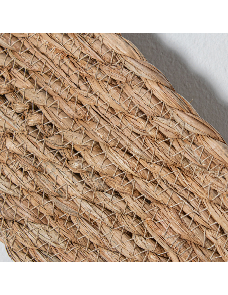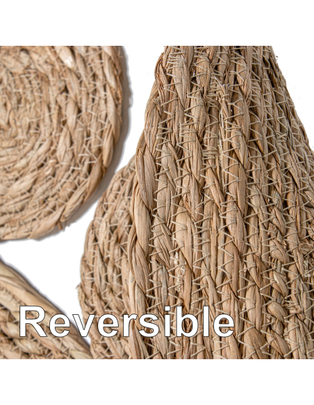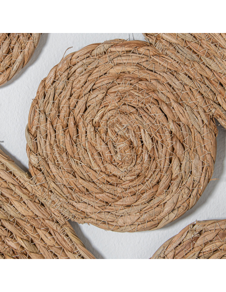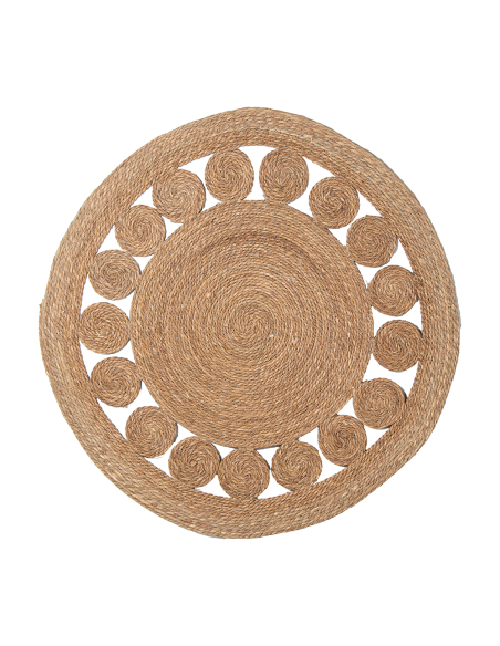 Alfombra redondeles mimbre 120 cm, confeccionada en fibras naturales, añade un toque distintivo a cualquier espacio. Con un tejido en color natural y costuras al tono, su diseño presenta un tramado circular en el centro, complementado por pequeños círculos en los laterales y un contorno ancho liso. Esta combinación de elementos aporta una textura única y una apariencia elegante, ideal para integrar en diversos estilos de decoración. Perfecta para salones, dormitorios o terrazas, su construcción duradera y su fácil mantenimiento hacen de esta alfombra una opción práctica y estética para tu hogar.