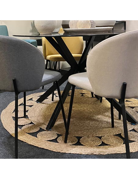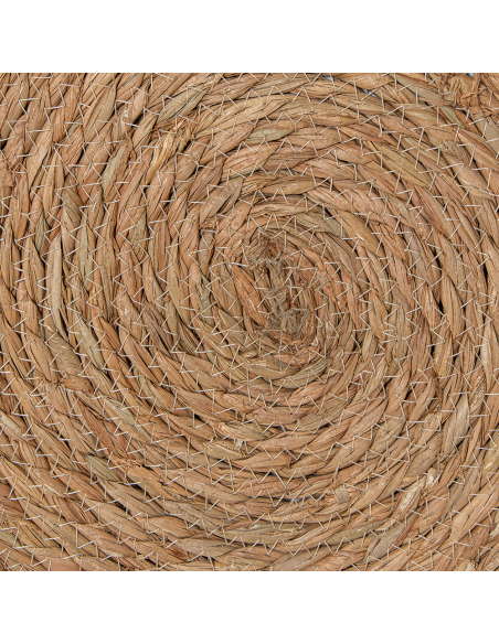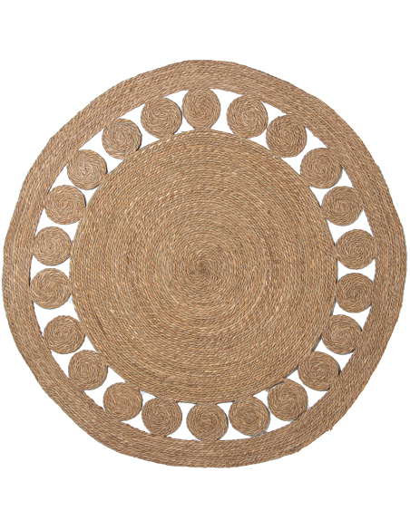 Alfombra redondeles mimbre 150 cm, confeccionada en fibras naturales, añade un toque distintivo a cualquier espacio. Con un tejido en color natural y costuras al tono, su diseño presenta un tramado circular en el centro, complementado por pequeños círculos en los laterales y un contorno ancho liso. Esta combinación de elementos aporta una textura única y una apariencia elegante, ideal para integrar en diversos estilos de decoración. Perfecta para salones, dormitorios o terrazas, su construcción duradera y su fácil mantenimiento hacen de esta alfombra una opción práctica y estética para tu hogar.