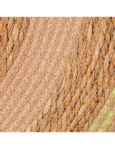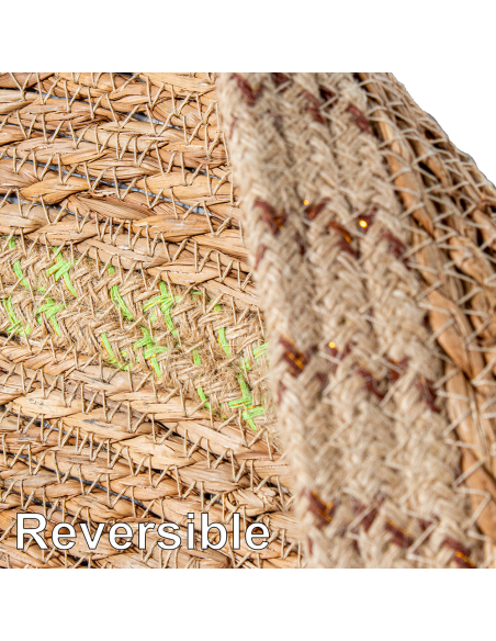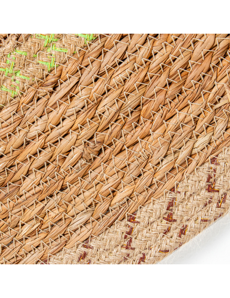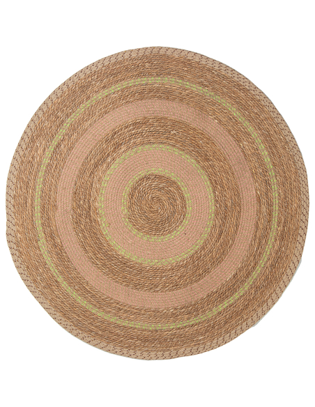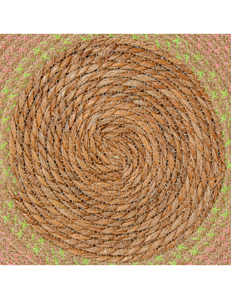 Alfombra espiral mimbre 150 cm natural/verde, confeccionado en fibras naturales, presenta costuras al tono que aseguran una apariencia uniforme y elegante. Su diseño distintivo cuenta con una disposición circular y un intercalado de hilos verdes, negros y rojos, creando un efecto visual único y atractivo. Ideal para salones, dormitorios o áreas de estar, esta alfombra no solo aporta un toque de color y textura a tu hogar, sino que también ofrece durabilidad y fácil mantenimiento.