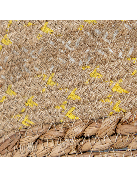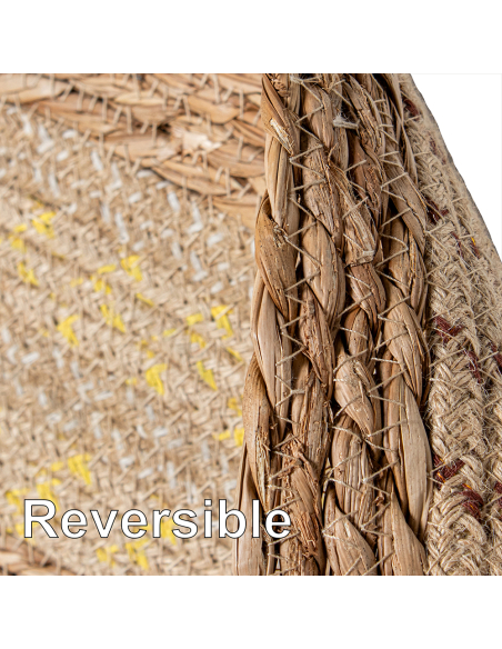 Alfombra espiral mimbre 120 cm natural/amarillo, confeccionado en fibras naturales, presenta costuras al tono que aseguran una apariencia uniforme y elegante. Su diseño distintivo cuenta con una disposición circular y un intercalado de líneas en color natural y amarillo, creando un patrón visual vibrante y atractivo. Ideal para salones, dormitorios o áreas de estar, esta alfombra no solo mejora la decoración de cualquier espacio, sino que también ofrece durabilidad y fácil mantenimiento.