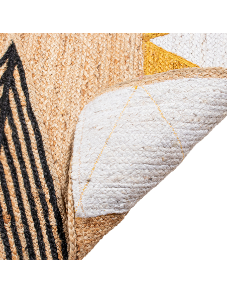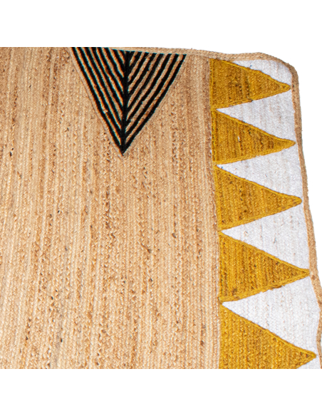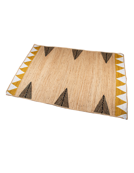 Alfombra yute 230 cm triángulos, su diseño presenta un patrón de triángulos que combina elegancia con simplicidad, ideal para cualquier espacio moderno. Hecha de yute liso y resistente, esta alfombra proporciona tanto estilo como durabilidad, perfecta para colocar en salones, dormitorios o cualquier lugar que desees decorar con un toque único. Sus laterales en blanco y amarillo presentan un patrón de triángulos que aporta dinamismo y modernidad al ambiente. Los contornos de figuras geométricas triangulares en color negro resaltan el diseño, mientras que el resto de la superficie está tejida en yute liso, proporcionando una textura natural y duradera. Disponible en varias medidas, esta alfombra es perfecta para complementar cualquier espacio con un toque contemporáneo y vibrante.