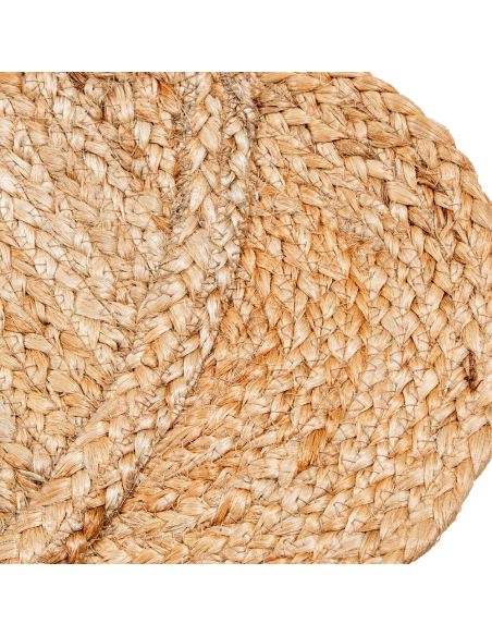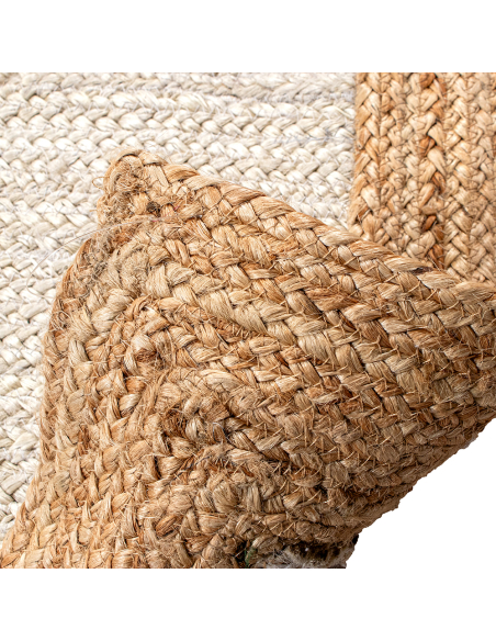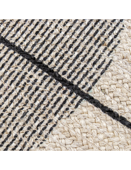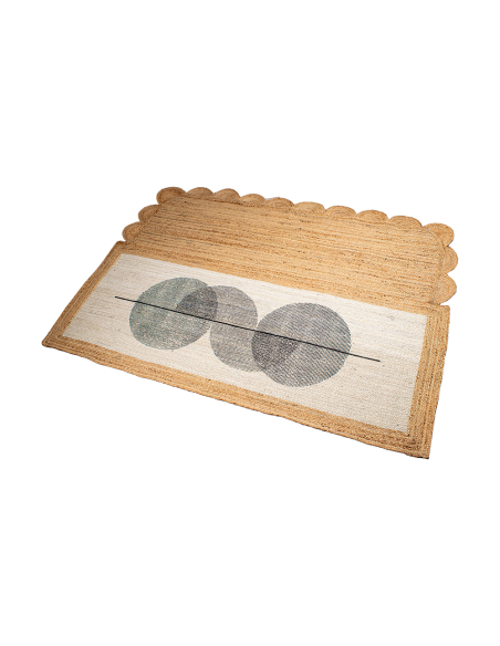 Alfombra yute 170 cm combinada con ondas, destaca por su diseño combinado de ondas. Una mitad rectangular presenta un diseño liso con un rectángulo blanco en la superficie, decorado con un estampado de círculos formados por líneas en color negro, añadiendo un toque de modernidad y elegancia. La otra mitad rectangular con contorno de ondas agrega textura y dinamismo al conjunto, creando un ambiente acogedor y estéticamente atractivo en cualquier habitación de tu hogar.