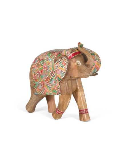 Elefante decorativo Presto colores, está realizado en madera maciza de mango y trabajada totalmente a mano: talla artesanal, pintura multicolor con motivos geométricos y detalles con efecto espejo que captan la luz y realzan la veta natural. Su estética boho-étnica aporta color y personalidad al salón, recibidor o dormitorio, ya sea sobre un aparador, consola o estantería. Cada pieza es única, con pequeñas variaciones propias del trabajo manual, y llega lista para usar. Si buscas una escultura de madera de mango que sume carácter, esta pieza es ideal para completar la decoración o para un regalo original con inspiración oriental.