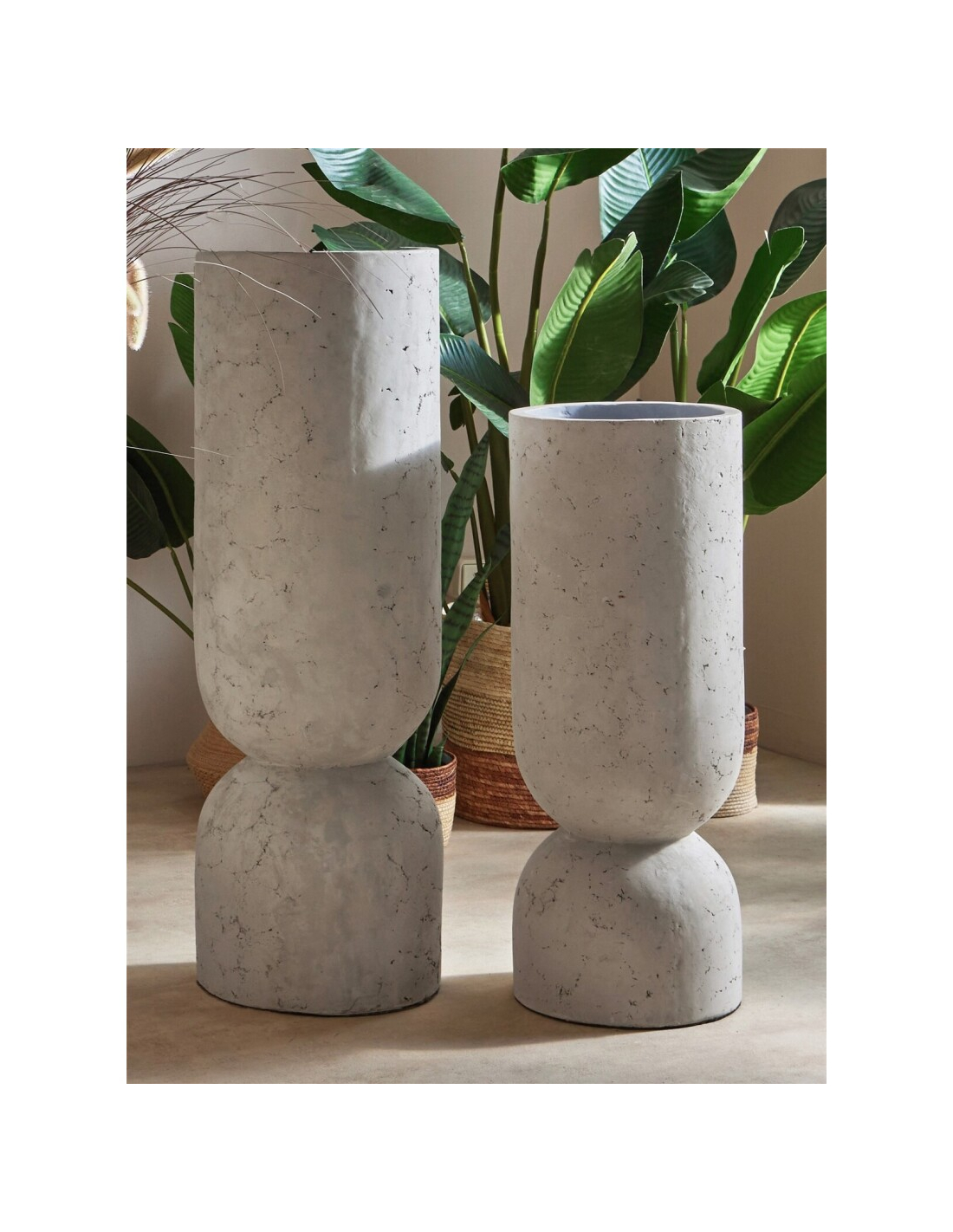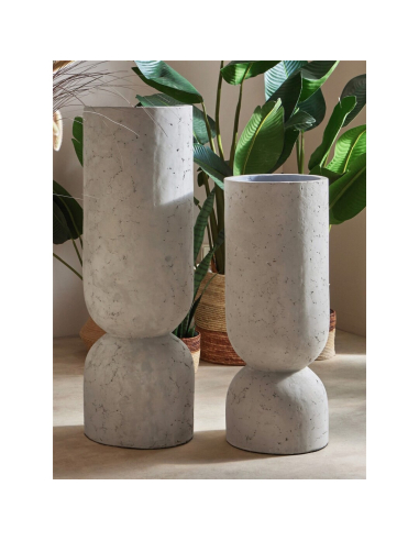Set 2 vasijas símil piedra gris 100 cm, set de dos vasijas en acabado gris con textura que imita la piedra, combinando naturalidad y resistencia. El diseño alargado y su tonalidad neutra las hacen fáciles de integrar en cualquier estilo decorativo. Perfectas para resaltar esquinas, acompañar muebles de madera o dar protagonismo a ambientes minimalistas, aportando elegancia discreta.