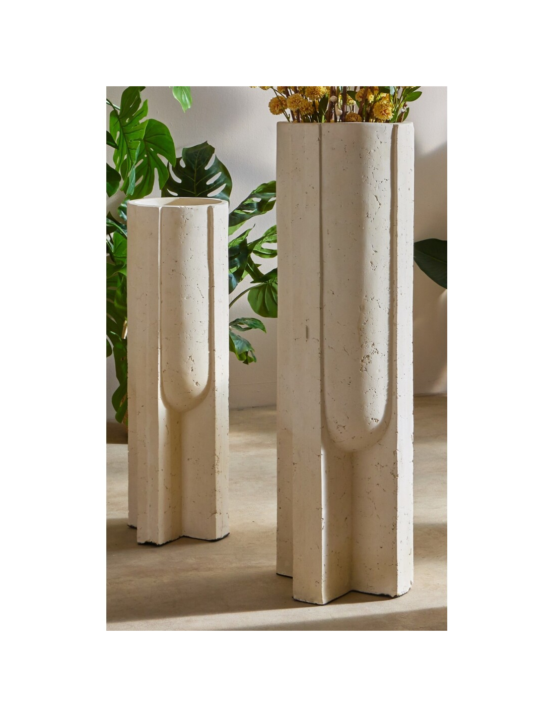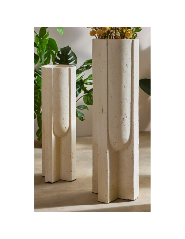 Set 2 vasijas símil piedra base cruz 101 cm, estas vasijas altas presentan un original diseño con base en cruz que aporta estabilidad y una estética contemporánea. Acabadas en blanco con textura símil piedra, evocan la serenidad de los materiales naturales y se convierten en piezas versátiles para distintos estilos decorativos. Perfectas para realzar rincones con arreglos florales, ramas secas o incluso solas como esculturas decorativas. Fabricadas en fibrocemento, aseguran durabilidad y resistencia, adaptándose tanto a espacios interiores elegantes como a zonas exteriores donde aportan luz y pureza al ambiente.