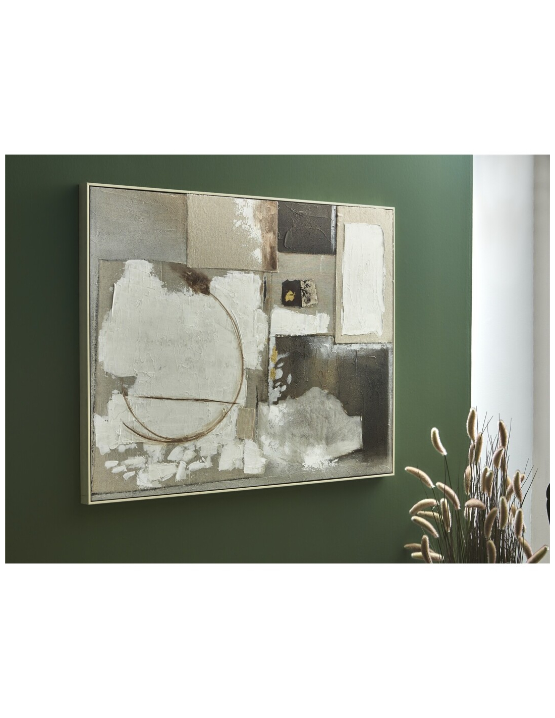 Cuadro abstracto arpillera y óleo 92x122 cm, obra decorativa en formato rectangular con marco de polietileno y bastidor de pino, que combina arpillera y óleo para crear un efecto de texturas en relieve. El diseño abstracto con trazos geométricos y colores neutros aporta dinamismo y carácter artístico, convirtiéndose en el complemento ideal para paredes de salones, dormitorios o despachos. Gracias a su paleta en tonos tierra, blancos y grises, resulta muy versátil y fácil de integrar en diferentes estilos decorativos. Su tamaño de 92x122 cm lo convierte en una pieza protagonista que transforma cualquier espacio con un aire moderno y sofisticado.