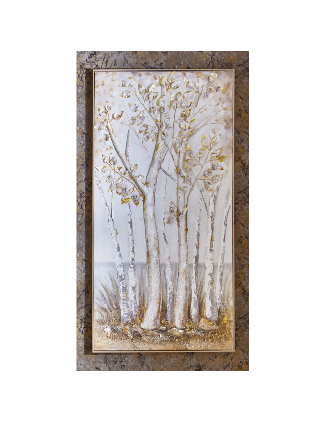Cuadro 8 Árboles en relieve madera con marco, pieza con bastidor de pino y marco PE que presenta un detallado relieve de árboles estilizados en tonos cálidos y dorados. El acabado texturizado aporta profundidad y realismo, convirtiéndolo en un complemento ideal para crear un ambiente acogedor y natural. Perfecto para destacar paredes amplias, este cuadro se adapta tanto a salones modernos como a decoraciones de estilo rústico o nórdico, aportando calidez y personalidad.