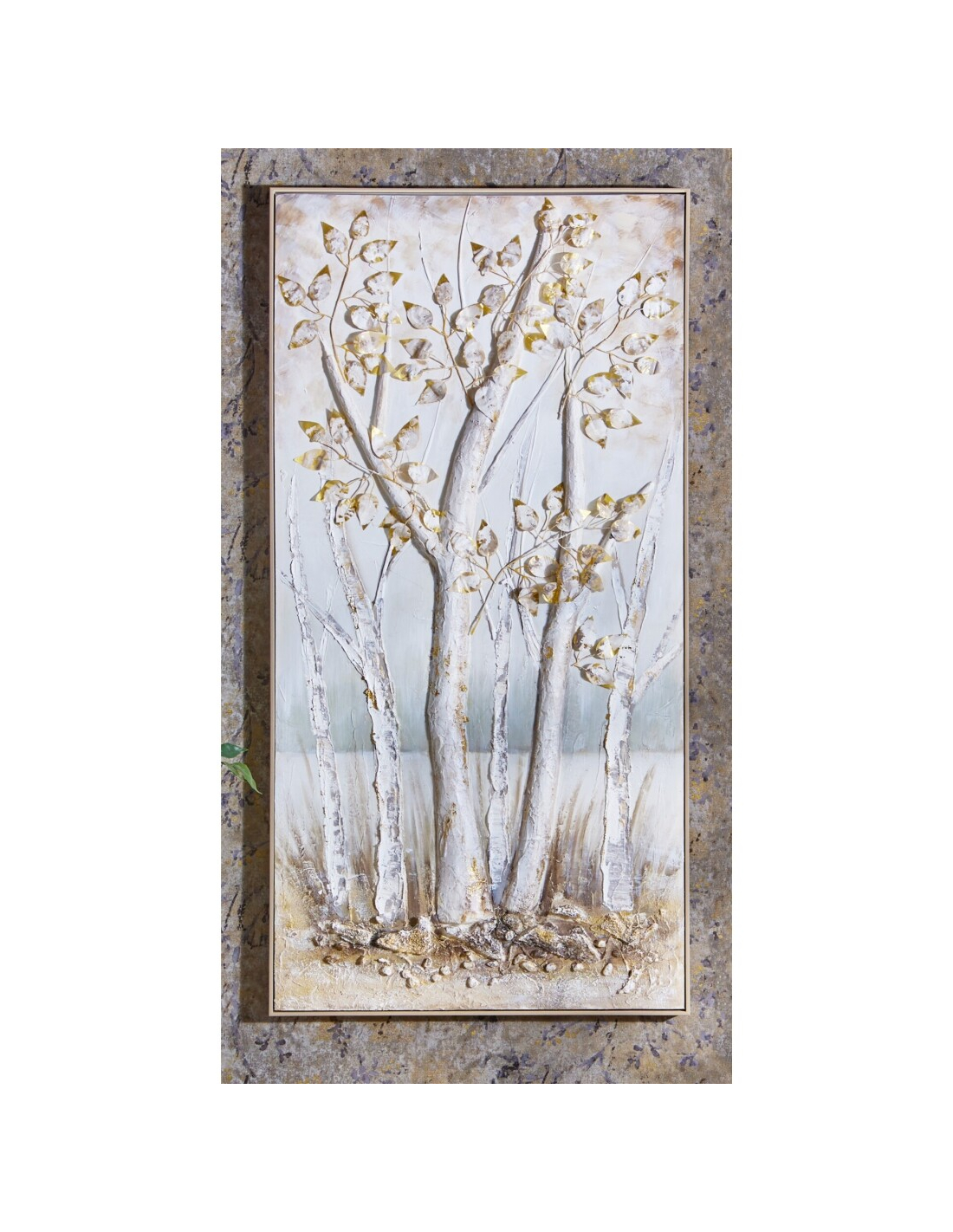 Cuadro 6 Árboles en relieve madera con marco, lienzo con bastidor de pino que realza la belleza de la naturaleza con un diseño en relieve de árboles. Sus tonalidades suaves y detalles dorados transmiten serenidad y equilibrio, convirtiéndose en una pieza ideal para aportar un toque orgánico a la decoración. Perfecto para ubicar en espacios amplios como comedores, pasillos o salas de estar, su diseño atemporal lo hace fácil de integrar con distintos estilos decorativos.