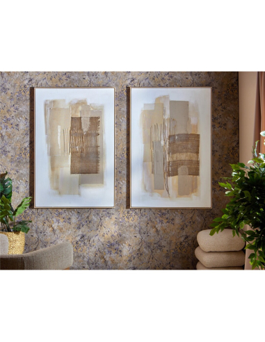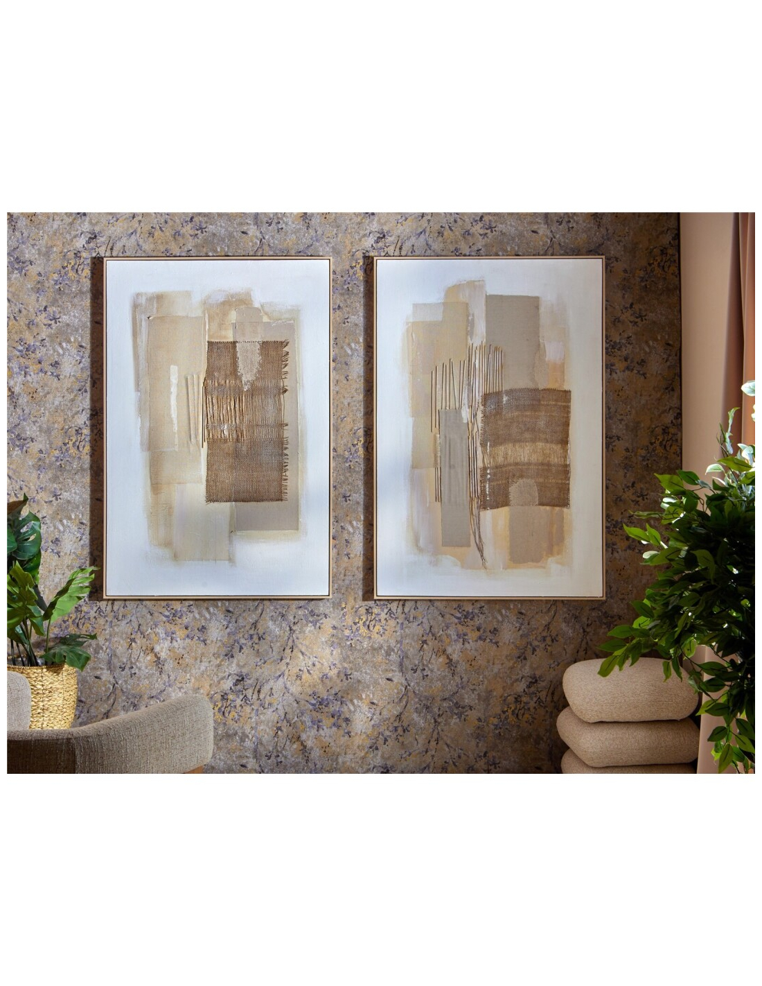 Set 2 cuadros abstractos arpillera 120 cm, lienzos con bastidor de pino y enganche en posición vertical, que se destacan por la riqueza en texturas y la combinación de arpillera con técnicas mixtas. Su estilo artesanal y sofisticado lo convierte en una propuesta decorativa única, capaz de llenar de carácter paredes neutras o minimalistas. Perfectos para colocarse en conjunto, aportan armonía y un aire contemporáneo que realza cualquier ambiente.