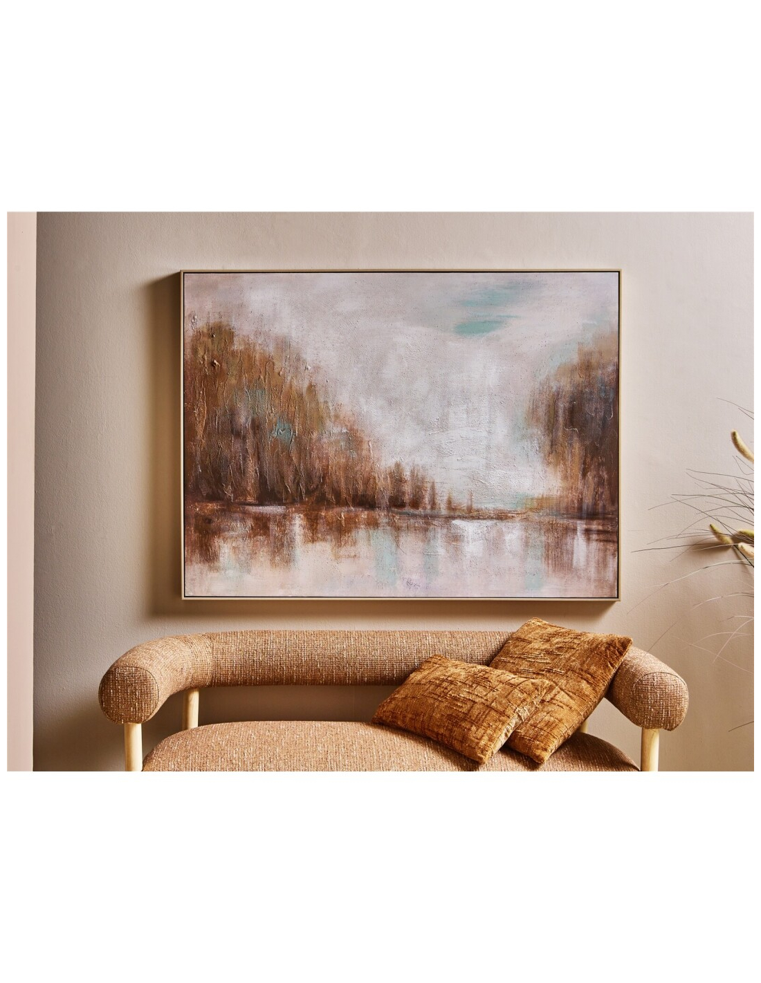 Lienzo impreso Río marrón con marco, lienzo con bastidor de pino y colgadores horizontales que reproduce un paisaje abstracto con tonos cálidos y marrones. Su diseño transmite serenidad y elegancia, evocando la calma de la naturaleza junto a la orilla de un río. Perfecto para salones, comedores o dormitorios, aporta una nota artística y acogedora que se integra fácilmente en diferentes estilos decorativos.
